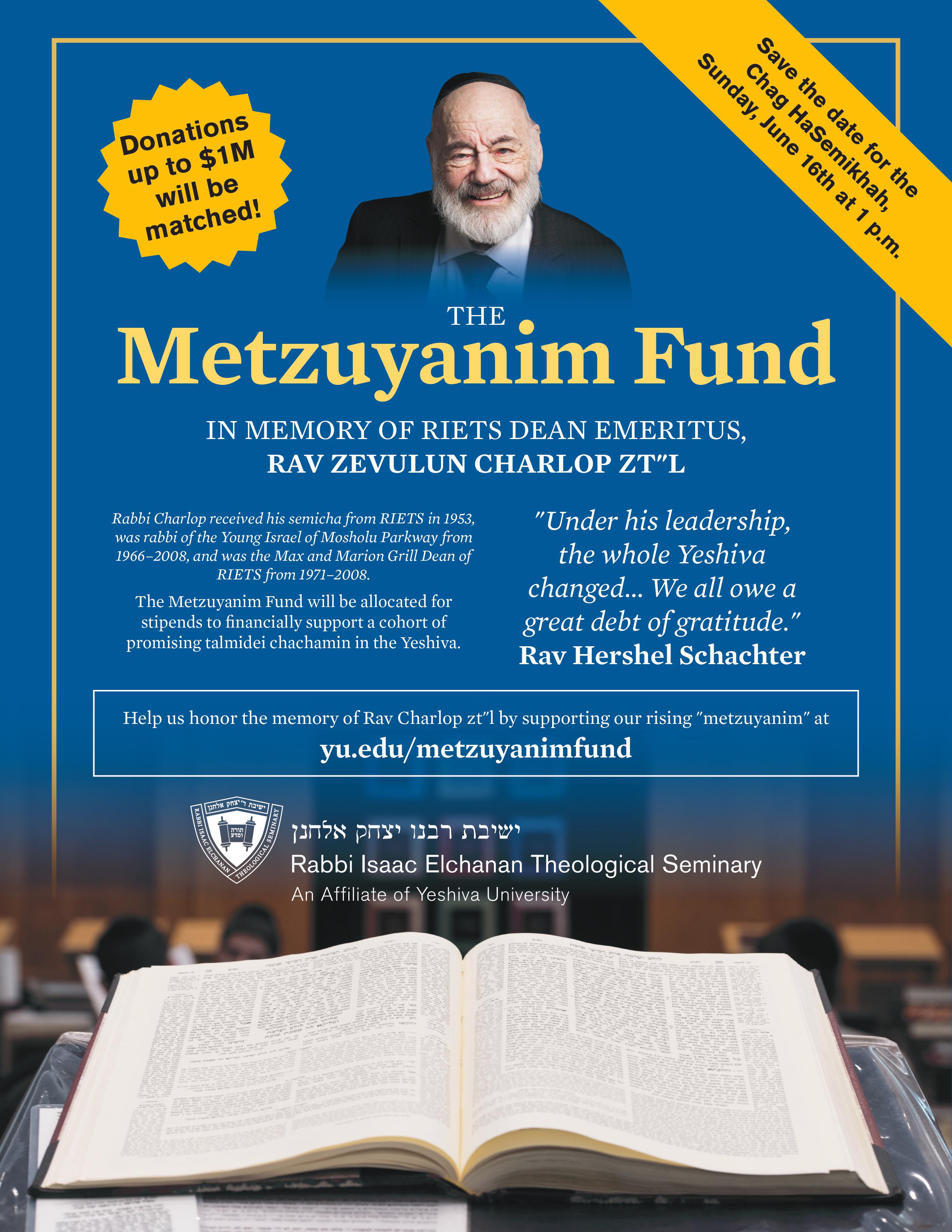 Our Dean Emeritus, Rabbi Zevulun Charlop Zt"l, was a pillar of the RIETS community for decades and aided countless talmidim (or, as he would say, "metzuyanim") on their path to becoming rabbanim. As we prepare to celebrate the Chag HaSemikhah, we are privileged to establish the Metzuyanim Fund in his memory to financially support a yearly cohort of promising talmidei chachamim learning in our kollel. Thanks to a generous donor, contributions will be matched up to $1 million! Please consider supporting our rising metzuyanim in order to continue the tradition of excellence and success in learning that Rabbi Charlop embodied. Donations can be made at https://es.2jryb.shop/MetzuyanimFund