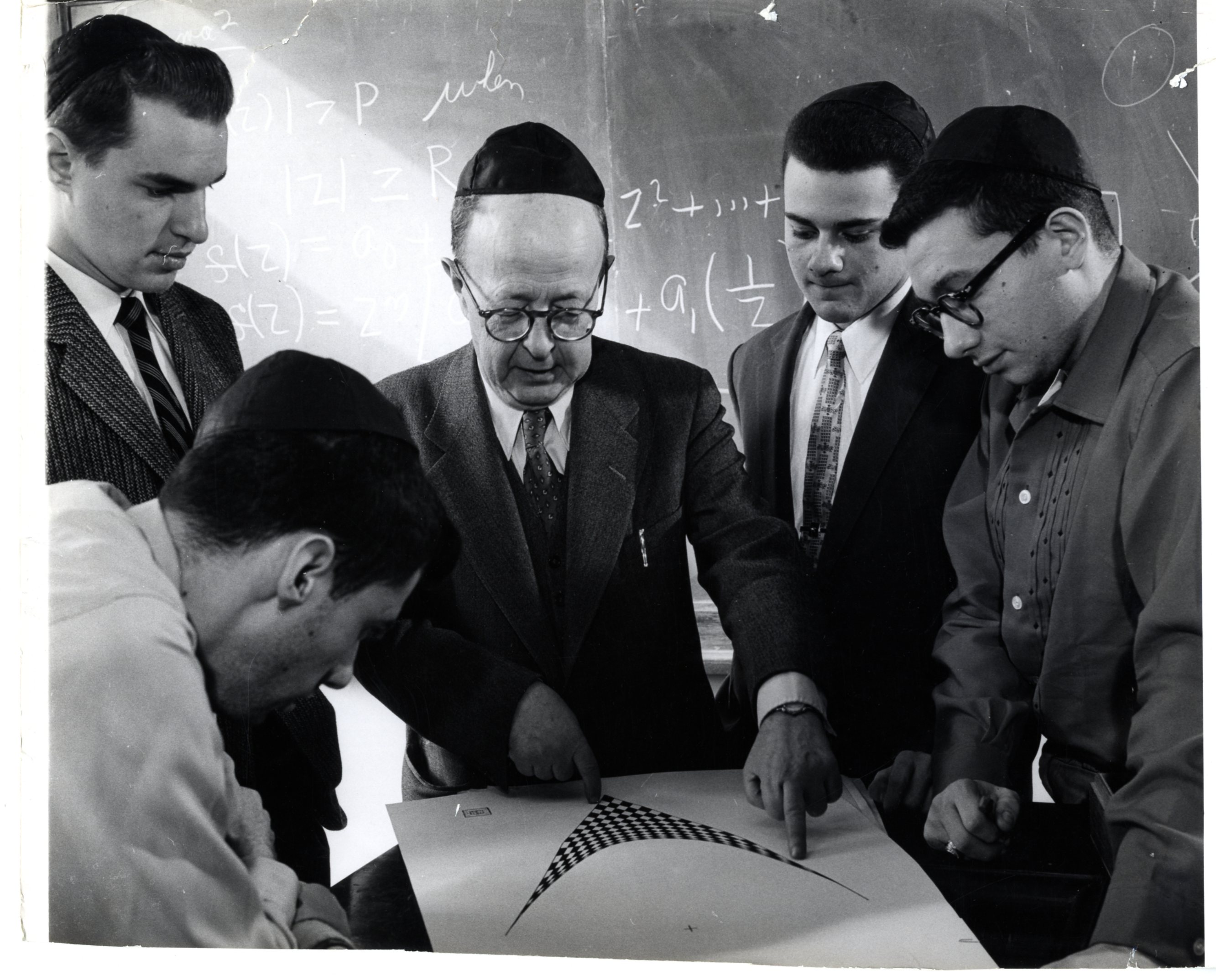 The 1939 World’s Fair opened in New York with the optimistic theme, “The World of Tomorrow.” The Fair organizers envisioned a future world of 5000 years of tomorrows, earth dwellers of 6939, who would be intrigued by the civilization of their ancestors. The Westinghouse Company took on the challenge of creating a time capsule capable of lasting 5,000 years and curating its contents. A Yeshiva College publication, Portraits of Eminent Mathematicians by David Eugene Smith, was selected to be part of this treasure, buried at the site of the World’s Fair on September 23, 1938. Portraits of Eminent Mathematicians was an offshoot of Yeshiva’s periodical, Scripta Mathematica. Scripta Mathematica was the brainchild of Yeshiva College mathematics professor Jekuthiel Ginsburg, editor of the quarterly from its inception in 1932 until his death in 1957. Jekuthiel Ginsburg at work.In the words of David Fleisher, professor of English at Yeshiva College, “The honor accorded these publications [Scripta] at the World’s Fair was a significant indication of the world-wide recognition which in a few short years the purposes and accomplishment of Scripta had achieved.” Portraits of Eminent Mathematicians. 1946 reprint. Portraits of Eminent Mathematicians, 1938 Portraits of Eminent MathematiciansBernard Revel, President of Yeshiva College, explained in the first issue of Scripta that “the policy of the Journal is in agreement with the ideal of ‘learning for the sake of learning’ which inspired the founders of Yeshiva College.” The initial issue also described the goal of the periodical: it